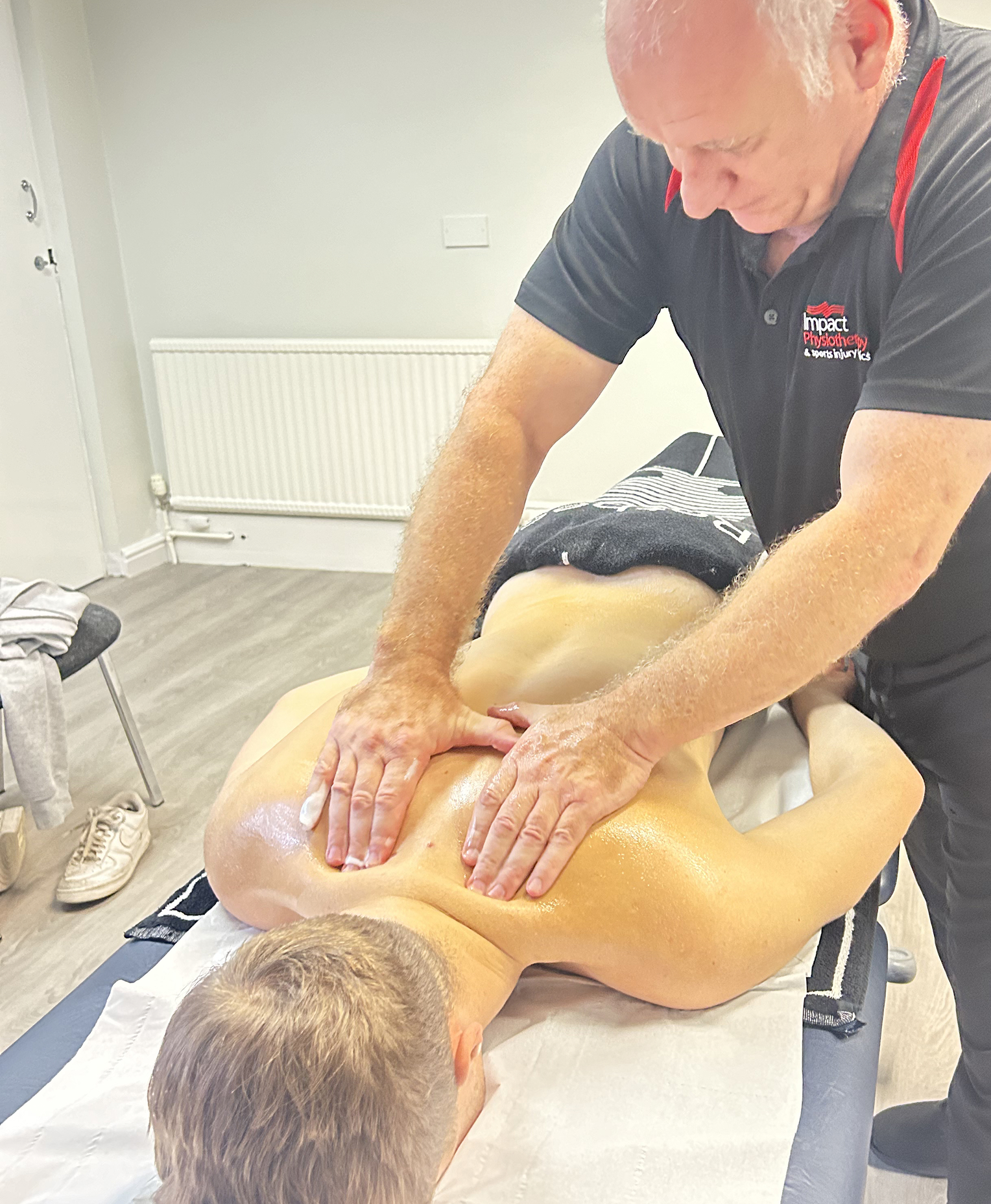 Females are asked to wear a back fastening bra so that the upper back and shoulders are easily accessed, sports bras can be awkward in this situation. Long or tight shorts are often restrictive so are not ideal as access to the hamstrings/adductor attachments can be difficult.